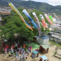 子どもたちが作った“こいのぼり”も一緒に空に泳いでいます。こいのぼりの下で元気に遊んでいるよ!
