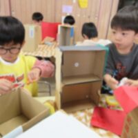 造形あそび展の個人製作をしました。今年のテーマは箱を使って家をつくる。毛糸でマフラーを編む。どちらか好きなほうを選びます。 箱を使って家の壁を作りました。 「できてきた!」嬉しそうです