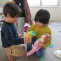 新しいお人形がやってきました。「こうやるの?」とオムツを交換したり、ご飯を作ったり。お部屋あそびもたのしいね。 「おいものみそ汁おいしいかな~」と絵本を見ながら楽しみにしています。 “あちっち”と、手ミトンをつけてお料理 …