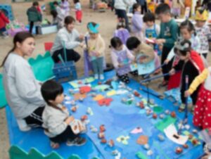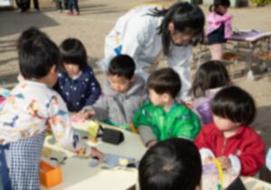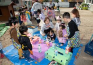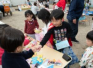 自分たちで作った“ネックレス”や“おもちゃ”“ゲーム”を幼児の子どもたちが「お店やさん」と「お客さん」に分かれて遊びます。乳児もお客さんになって全園児で楽しみます。