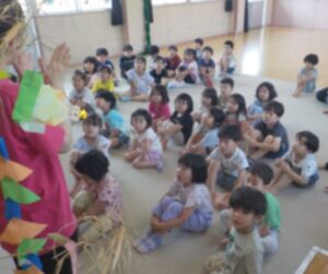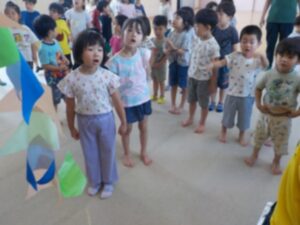 ホールで七夕集会と、もうすぐある年長クラスの「一泊保育頑張ってね会」をしました。