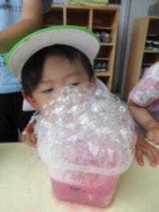 水の中にシャボン玉液を混ぜ、ストローでブクブクすると「かき氷みたい!」