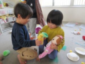 新しいお人形がやってきました。「こうやるの?」とオムツを交換したり、ご飯を作ったり。お部屋あそびもたのしいね。