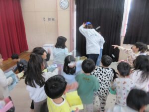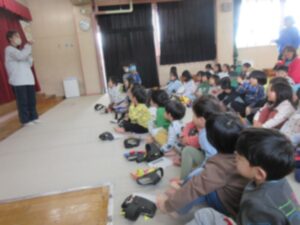 幼児3クラスがホールに集まって「節分集会」をしました。